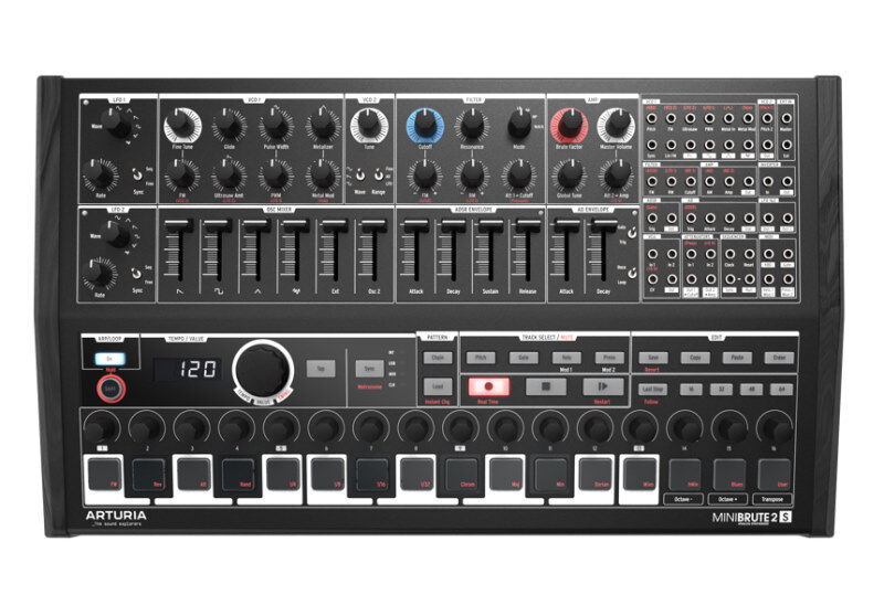 MiniBrute 2S Noir Edition to porywający hybrydowy syntezator usprawniony pod kątem współczesnego muzyka. Łącząc surową moc analogową, intuicyjny trójwarstwowy sekwencer krokowy, krosownicę modularną i czarną obudowę, MiniBrute 2S Noir to coś więcej niż syntezator.